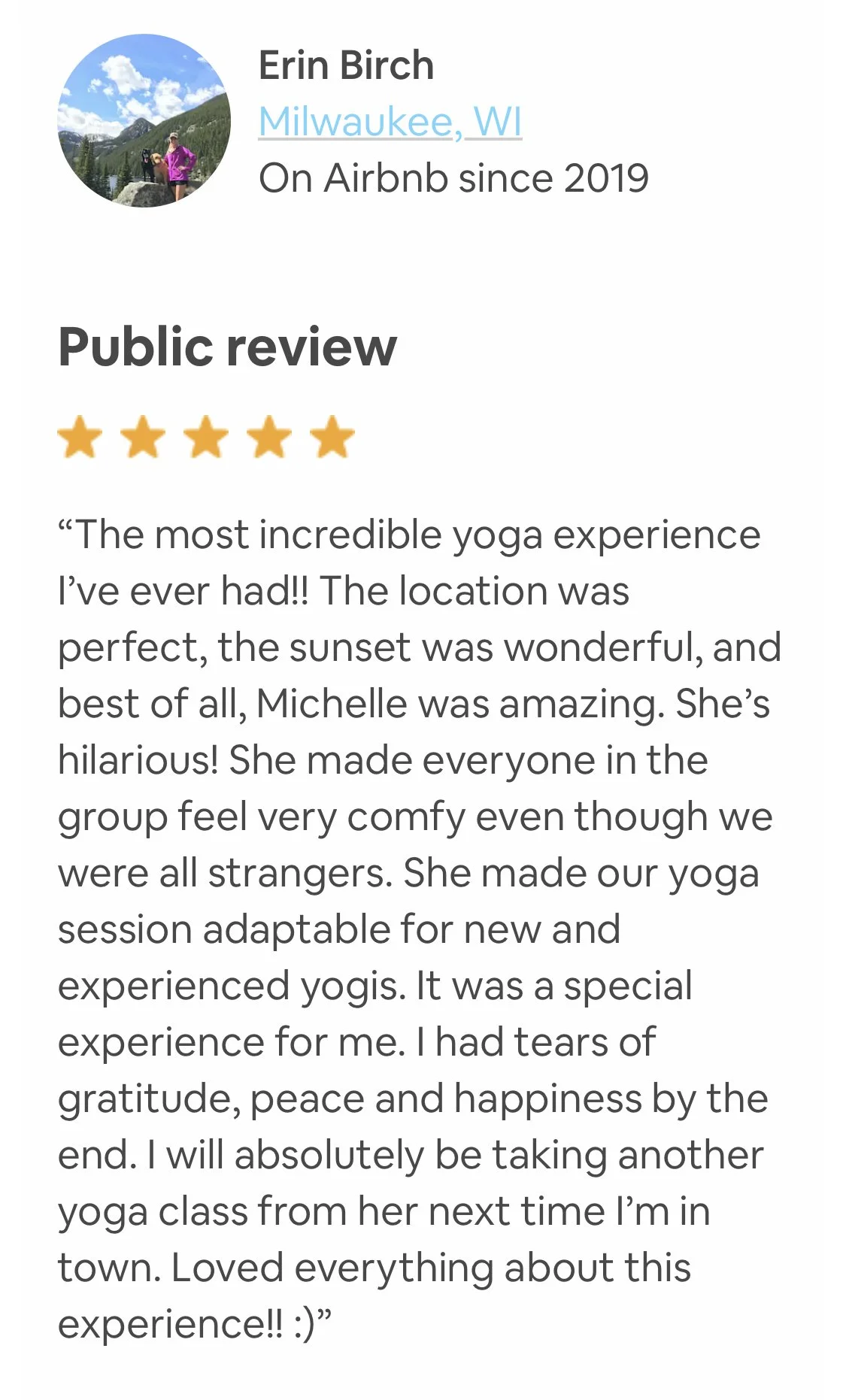 ✔ Class types: all-levels vinyasa yoga, gentle yoga, yin, partner